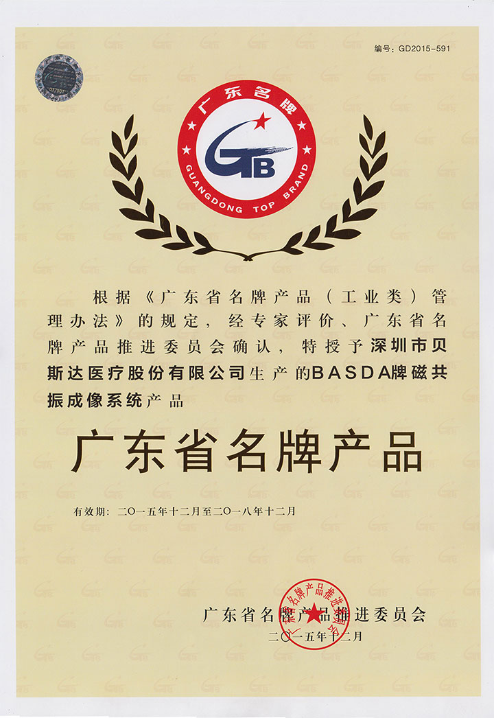 凭借精准的诊断功能、优秀的产品质量、出色的售后服务,贝斯达BASDA磁共振成像系统产品再次荣获"广东省名牌产品"的荣誉称号。贝斯达连续获得"广东省名牌产品"是多年来实行品牌战略的又一次出彩,是对贝斯达产品的全面评价,更是社会对贝斯达产品质量以及名气的认可,这表明贝斯达在质量管理、品牌建设、市场占有率、生产规模、技术创新等都处于领先地位,在打造贝斯达驰名商标和世界级的医疗器械品牌,又迈出了坚实的一步。