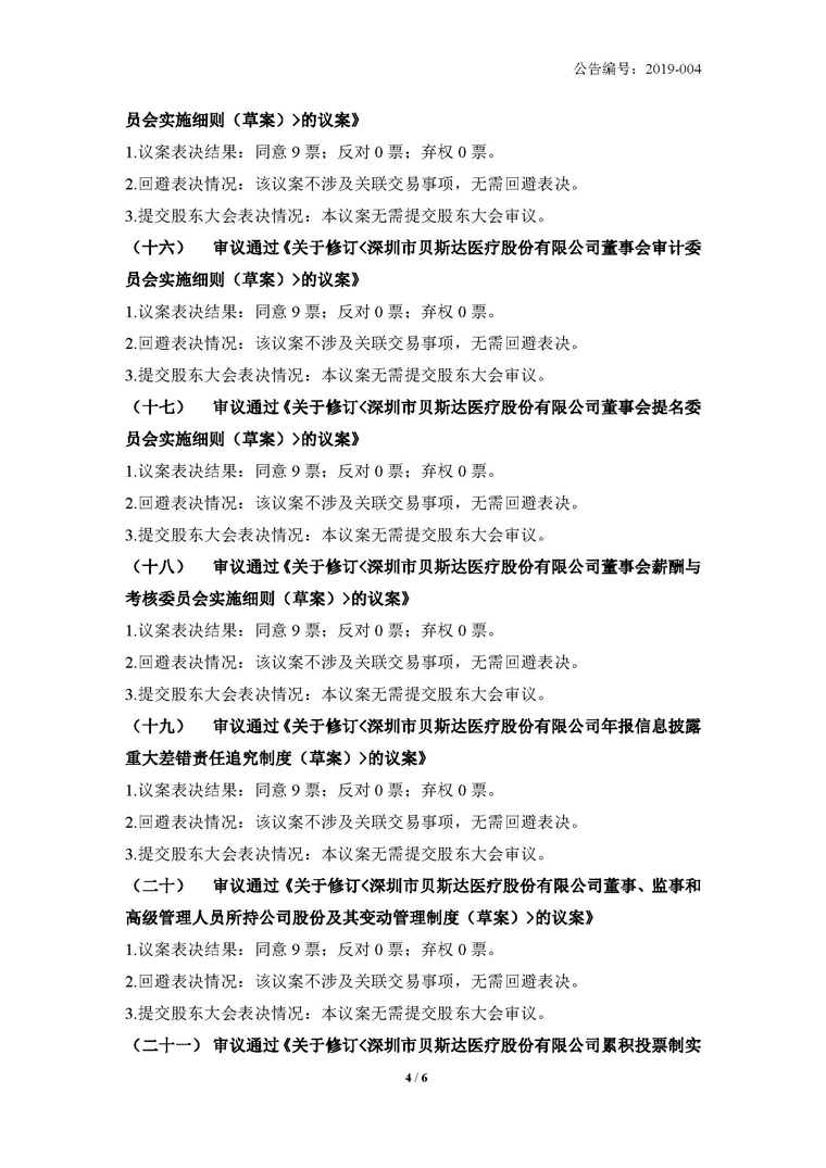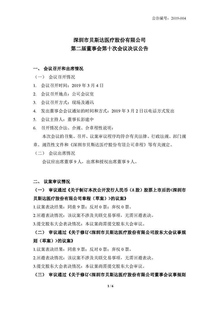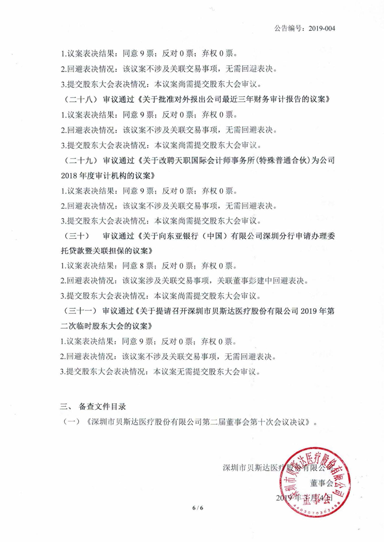 2019-004-贝斯达-第二届董事会第十次会议决议公告