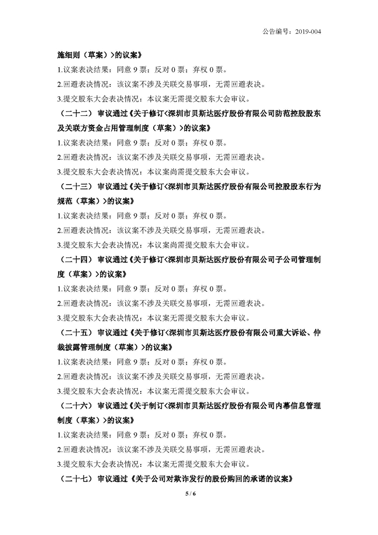 2019-005 贝斯达 第二届监事会第六次会议决议公告