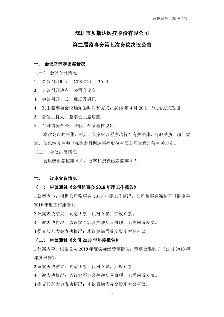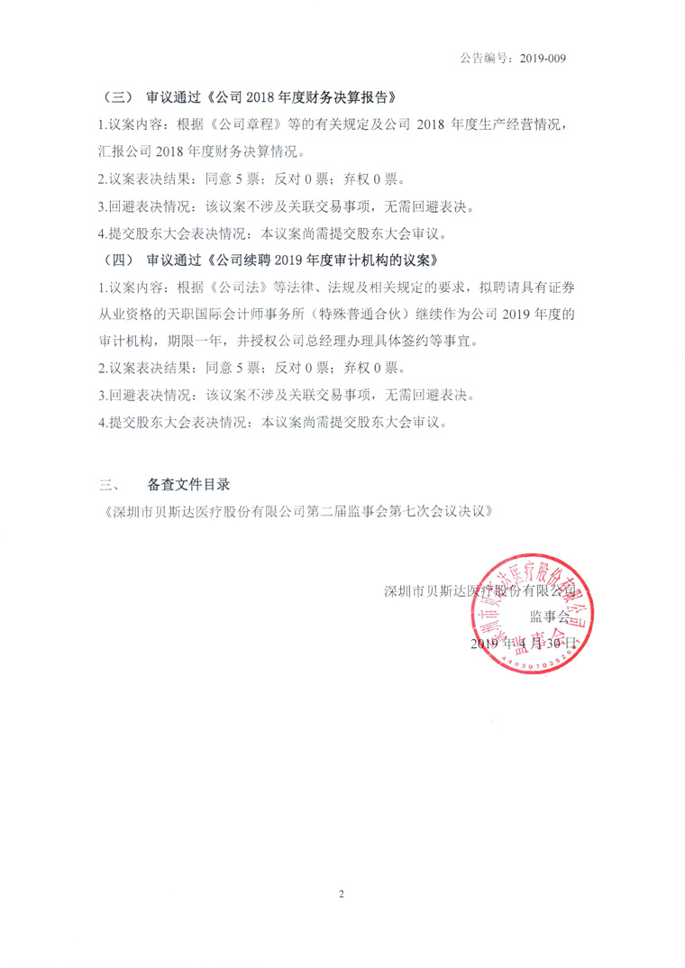2019-009-贝斯达-第二届监事会第七次会议决议公告
