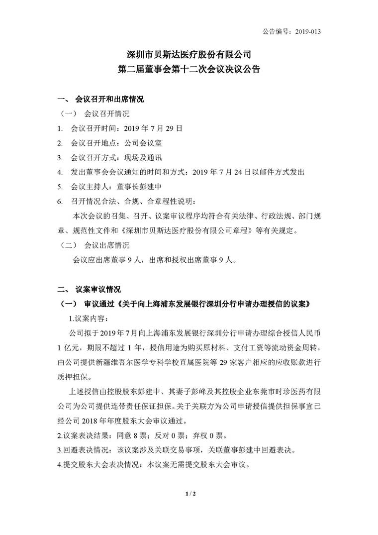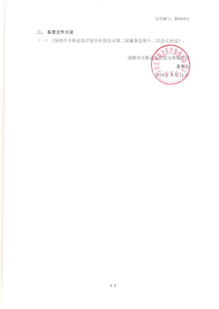 2019-013-贝斯达-第二届董事会第十二次会议决议公告