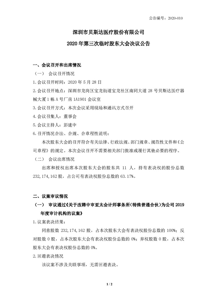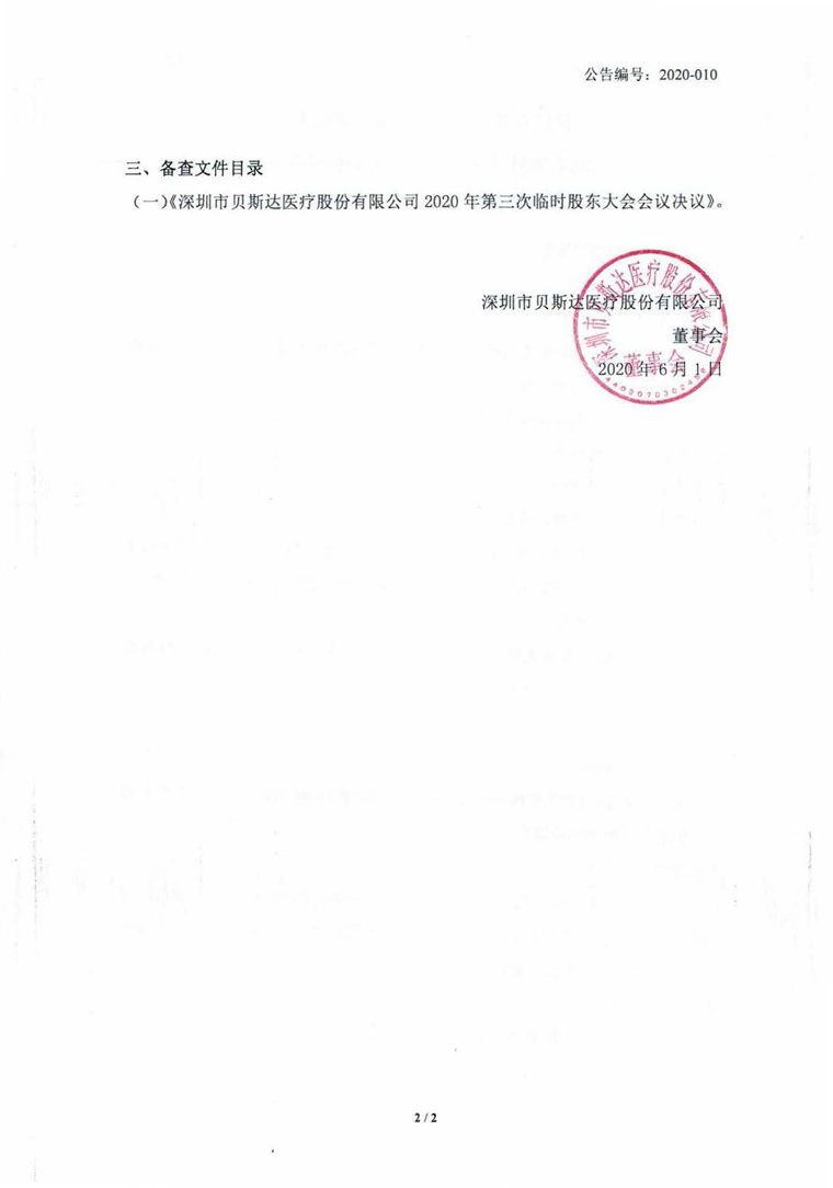 2020-010-贝斯达-2020年第三次临时股东大会决议公告