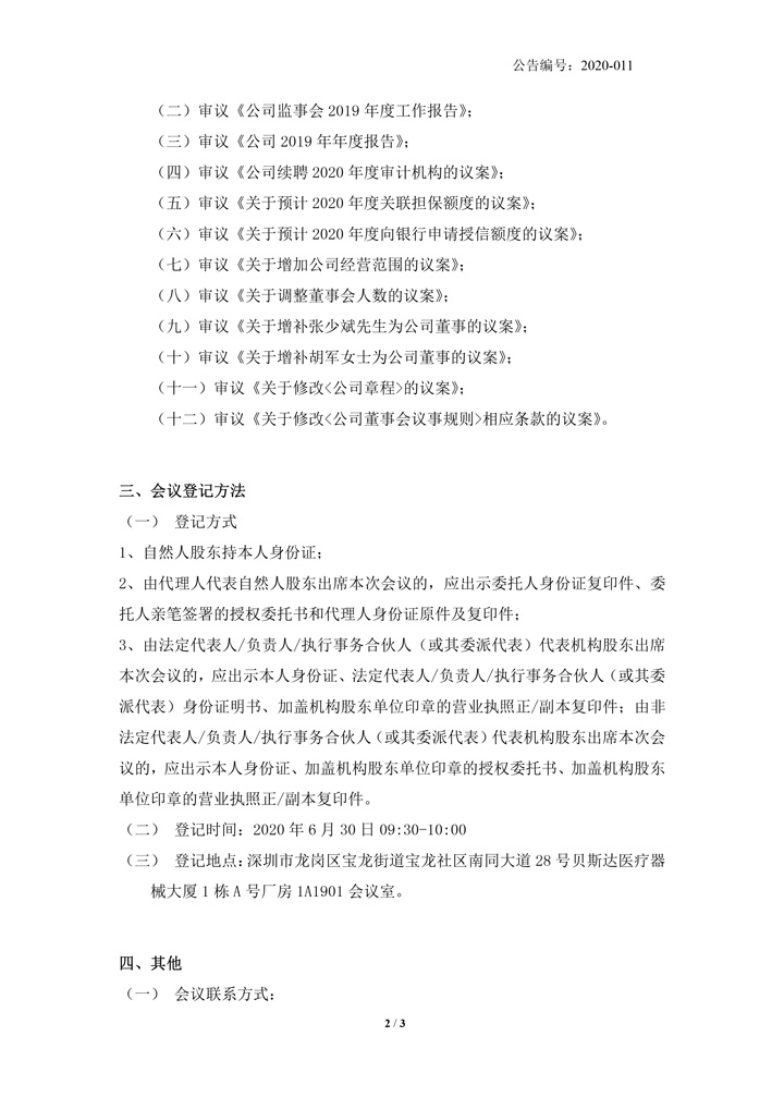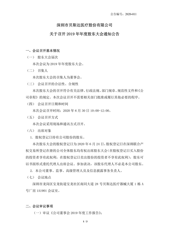 2020-011-贝斯达-关于召开2019年年度股东大会通知公告